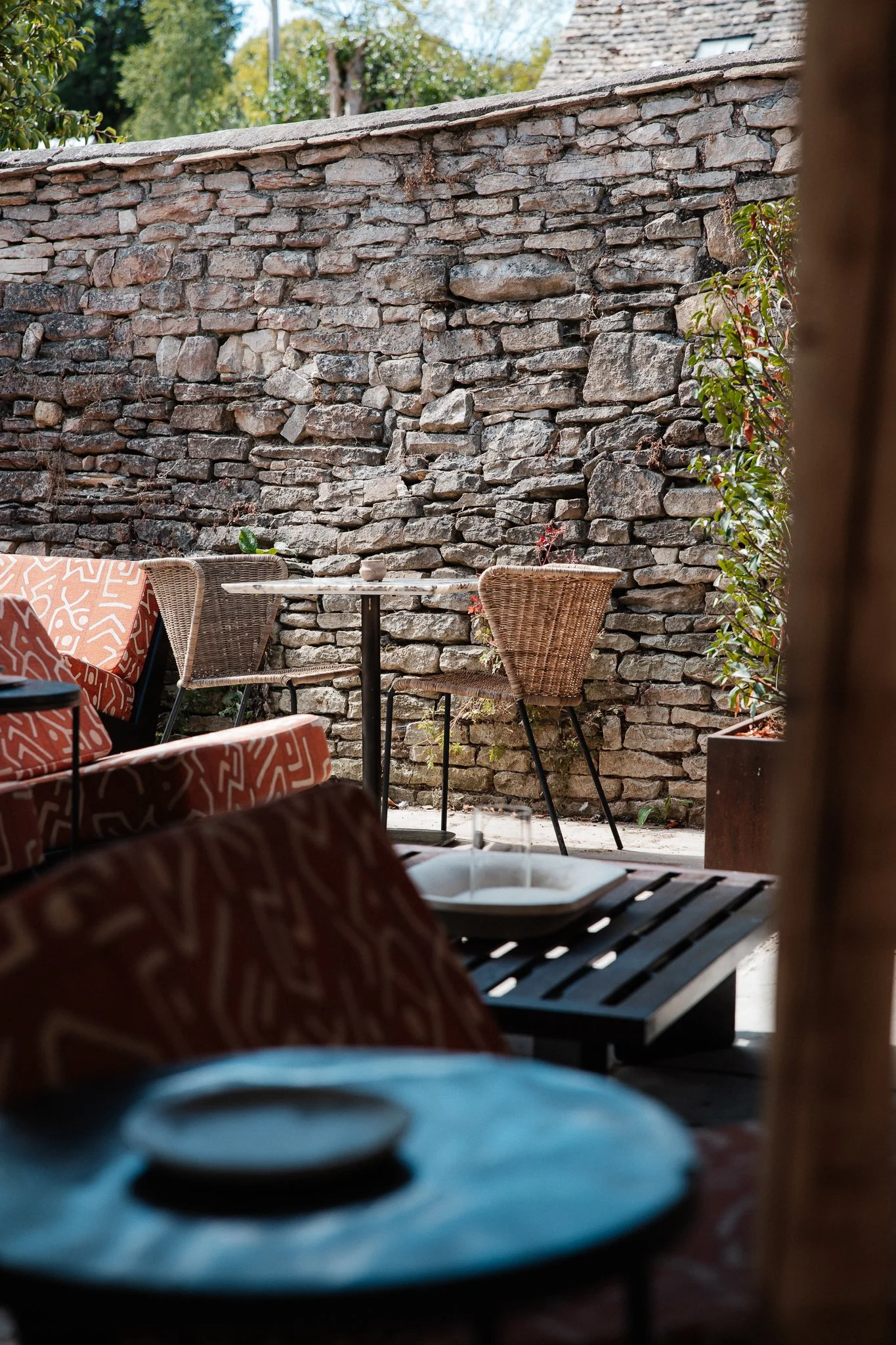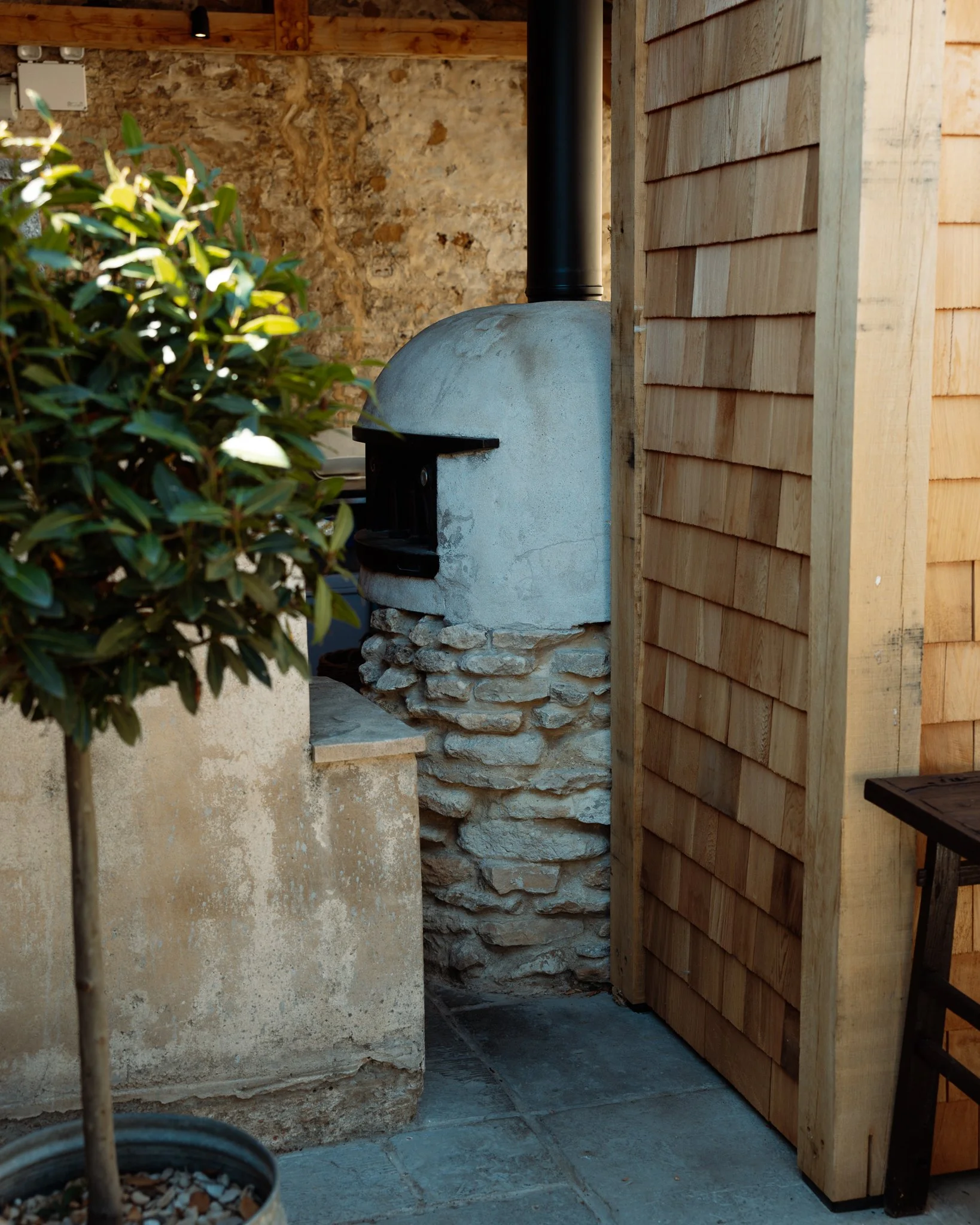 An outdoor oven with a rounded top and a black door, built on a stone base, situated in a space with a wooden wall and stone wall background, and a potted plant with green leaves in the foreground.
