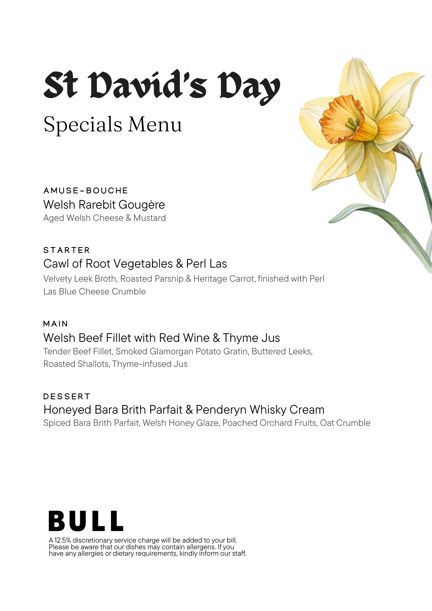 Join us as we raise a glass to our Welsh friends, with a special Menu celebrating classic dishes such as Cawl and Bara Brith. We’ll be serving this Menu alongside our classic roasts.